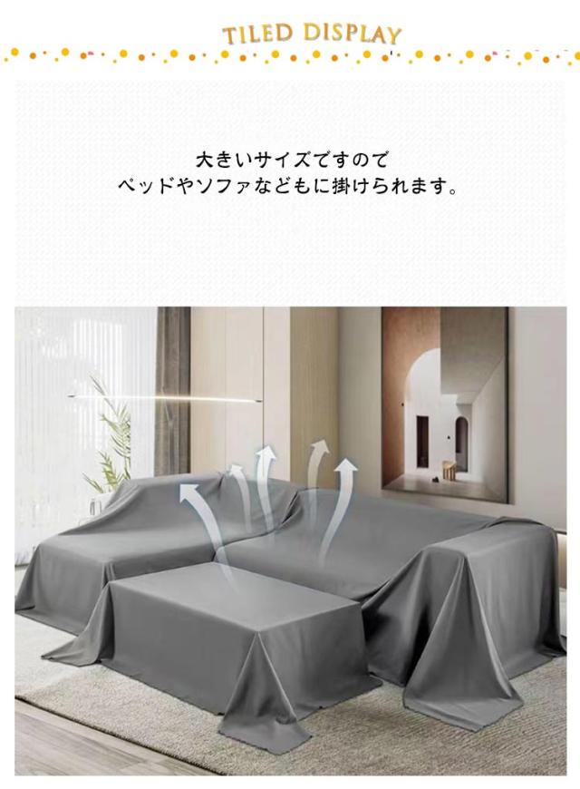 | 家具カバー。 家具などのホコリ除け、納品時等にお使いいただける大判カバーです。 大きいサイズですのでペッドやソファなどもに掛けられます。 長期間使わない家具家電や商品の納品時等に掛けておくだけで埃から守れる大判マルチカバーです。 人物、物撮り撮影の背景シートとしてや、上から吊ってちょっとしたパーテーション代わり、布を使った製作、店舗でのディスプレイ台やテーブルの上に敷いていただく等、アイデア次第で多種多様な使い方ができます。 | |