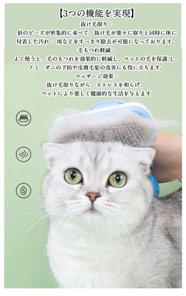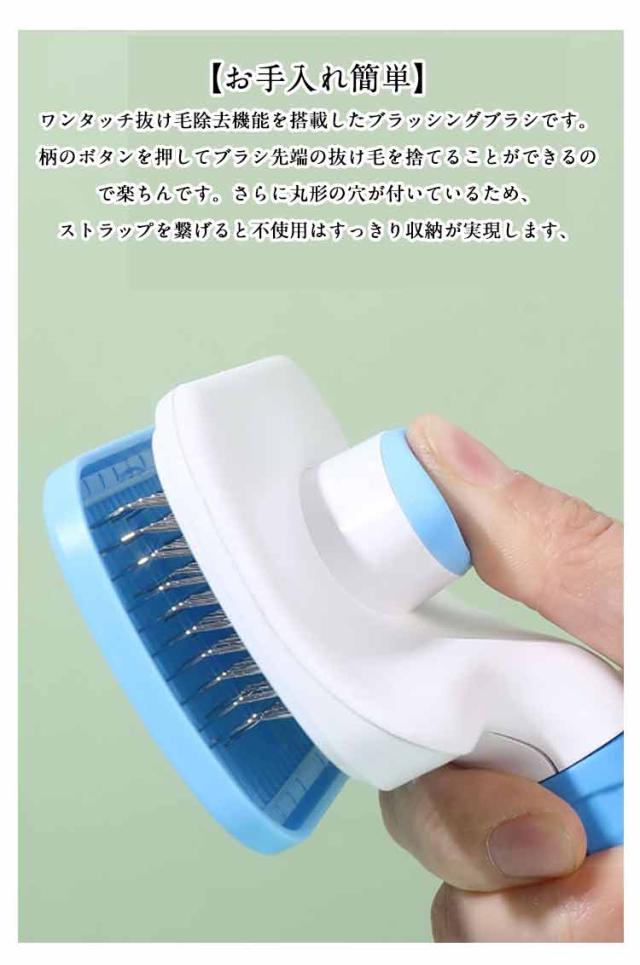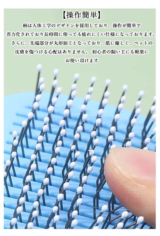 | 【適用対象と場合】 中毛?長毛犬、中毛?長毛猫など、犬猫通用のペット用ブラシです。トリートメント・マッサージ・抜け毛取り・シャワーなど、様々なシーンで大活躍してくれます。換毛期に毎日使えば、お洋服に付いた抜 け毛やお部屋に散らばった抜け毛が大幅削減でき、掃除も楽ちん。 【3つの機能を実現】 抜け毛取り:針のビーズが密集的に並べて、抜け毛が楽々に取りと同時に体に付着した汚れ・ 埃などをすっきり除去が可能になっております。 毛もつれ軽減:よく使うと、毛のもつれを効果的に軽減し、ペットの毛を保護 し、ノミ・ダニの予防や皮膚毛髪の改善にも役に立ちます。マッサージ効果:抜け毛取りながら、ストレスを和らげ、 ペットにより楽しく健康的な生活を与えます 【お手入れ簡単】 ワンタッチ抜け毛除去機能を搭載したブラッシングブラシです。柄のボタンを押してブラシ先端の抜け毛を捨てることができるので楽ちんです。さらに丸形の穴が付いているため、ストラップを繋げると不使用はすっきり収納が実現します、 【操作簡単】 柄は人体工学のデザインを採用しており、操作が簡単で省力化されており長時間に使っても疲れにくい仕様になっております。さらに、先端部分が丸形加工となっており、肌に優しく、ペットの皮膚を傷つける心配はありません。 初心者の飼い主にも軽楽にお使い頂けます 【安全な素材】 上質なABS、ステンレスと合成ゴム(TPR)で作られており、無毒低臭で安全にご利用いただけま す。環境ホルモンやアレルギー物質を含まない素材を採用しており、妊婦さんや乳幼児がいる家庭にもおすすめで す。さらに、丈夫で、耐久性にも優れており、長くご愛用いただけます | |
