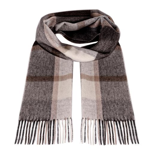 上質なデザインのレディースマフラー:チェック柄のデザインが定番のスカーフです。マフラーの端には細かいフリンジが施されており、デザイン全体に活気を与えています。