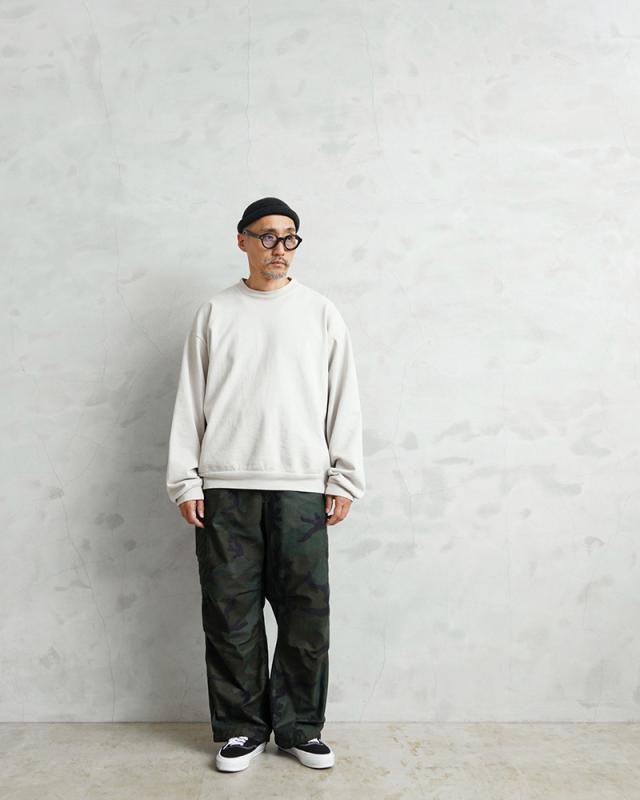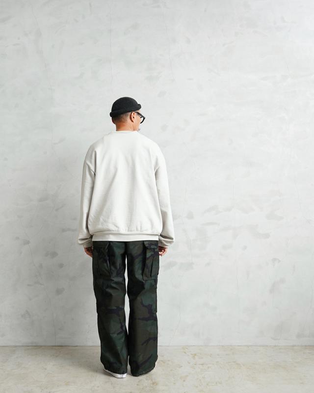 | 商品説明 | 実物 新品 デッドストック 米軍 M-65フィールドカーゴパンツ DARK WOODLAND CAMOのご紹介です。 制式名称:TROUSERS,COLD WEATHER,FIELD 米軍で1965年に採用されたフィールドカーゴパンツは現在ではデッドストックはもとより、USEDでさえも放出されることが無くなっているカーゴパンツのルーツを辿るには外せない希少な名作トラウザーズです。こちらは1981年から2005年頃まで米軍で採用されていたウッドランドカモにガーメントダイを施しました! 特殊な染色を行い、深くしっかりとブラックに染まったDEEP BLACKとは違い、もとの迷彩柄を残すように製品染めを施し、オリジナルのウッドランドデザインやカラーを活かしつつ、ダークトーンに仕上げています。 寒冷地で使用する際に中綿入りのキルティングライナーパンツをセットで装着するために多少ゆったりとしたシルエットでデザインされていますが、ライナーを使用しないのであればリラックスフィットで着用できるシルエットのカーゴパンツです。素材にはコットンナイロン混紡のバックサテンが使用されており、ドライタッチな素材感。耐風性にも優れた丈夫な質感のカーゴパンツです。 ウエストにはアジャスター付きでベルトなしでも着用できる仕様で、フラップ付きのサイドポケットとバックポケットは左右に2箇所づつ設けられており、ウエストの内側にも小型のウォッチポケットが備わっています。 マチ付きで大型のカーゴポケット内にはタイコードと呼ばれるカーゴポケットのサイドから引き出して使用するストラップが付属しています。怪我をした際の止血や、クロッチ部分のループに通してカーゴポケットを縛ることで収納物の音を立てないようにするための目的で付けられている特徴的なディテールです。 膝部分には膝を曲げた際に突っ張らないように2箇所のタックが入れられています。裾にはドローコード付きで絞って着用することでシルエットに変化を持たせて着用できます。細部にまで様々な画期的な機能が追加され、多くのブランドがリプロダクトしている点を見ても、服飾史に於いて重要なカーゴパンツと言えます。 近年では出回ることが非常に少なくなった未使用のデッドストック品を贅沢に使用しています。あるうちに手に入れておきたいミリタリーアイテムの1つです! | ||||||||||||||||||||||||||||||