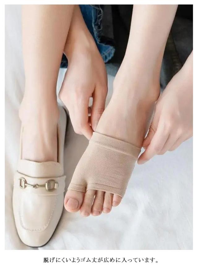 | 5足セット!ムレにくい指先レスの2本指フットカバー 指先レスタイプで、蒸れ防止にもなり、足もとの快適さを保ってくれます。 脱げにくいようゴム丈が広めに入っています。 吸水・速乾素材を使用しているので汗やムレを防ぎ、快適な足元をキープします。 パンプスやサンダルにおすすめ◎ | |