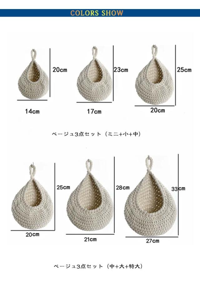 | おしゃれで使いやすい吊り下げ式バスケットです! 選べる5サイズ×5色 【3点セット】 【農産物を新鮮に保ちますか】ボヘミアンな手織りのフルーツハンギングバスケットは壁収納用です。 通気性に優れたプレミアムジュートコードで織られています。 彼らは野菜や果物をとてもよく保存することができます。 例:玉ねぎ、にんにく、じゃがいも、果物。 【手織りのハンギングバスケットクラフト】環境にやさしいジュートティアドロップハンギングバスケットは、綿糸とジュートロープという環境にやさしい素材を使用した100%手作りです。 それぞれの自然なハンギングバスケットは美しく細工されており、外観が独特です。 【省スペース】フルーツハンギングバスケットは、スペースをより有効に活用するのに役立ちます。 から選択する4つの異なるサイズがあります。 簡単な壁の装飾のためのハンドルまたは壁の植物ホルダーが付いている各バスケット。 【お手入れ方法】ジュートウォールハンギングバスケット天然ジュート製品として、天然繊維を洗浄するように設計された中性洗剤を使用してください。冷水で別々に手洗いしてください。 塩素製品とアイロンをかけないでください。 自然乾燥が最適です。 【用途が広い】壁に取り付けられた果物や野菜のバスケットは、壁、ドア、クローゼット、キッチン、庭、または収納用品に簡単に掛けることができます。 ピクニック、ハイキング、保管にも使用できます。 これはあなたの家の装飾に素朴な、コテージと農家のスタイルに沿った機能をもたらします。 | |