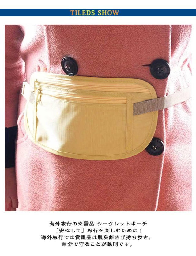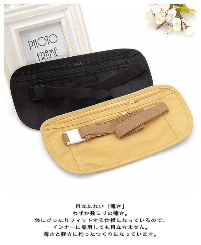 | 旅行の必需品 シークレットポーチ 【2個セット】 海外旅行の必需品 シークレットポーチ 「安心して」旅行を楽しむために! 海外旅行では貴重品は肌身離さず持ち歩き、 自分で守ることが鉄則です。 特に、パスポートや財布、クレジットカードなどは、 絶対に盗まれないように管理しなければなりません。 衣服の下に隠して携帯できるシークレットポーチに貴重品を保管することで、 安心して海外旅行を楽しめるようになります。 目立たない「薄さ」 わずか数ミリの薄さ。 体にぴったりフィットする仕様になっているので、 インナーに着用しても目立ちません。 薄さと軽さに拘ったつくりになっています。 たっぷり「収納力」 ポケットは大・小の2箇所あり、必要なものをしっかり収納できます。 小ポケットはパスポートやiPhoneが入るサイズ感です。 大ポケットはお札を折らずに入れられ、 iPhone pro MAXなど大きいスマホも収納可能です。 ウエスト長:最大65cm(平置き測定) 伸縮性のあるゴム素材なので100cm程まで伸びます からだにフィット ベルト部分は伸縮性のあるゴム素材を採用。 ベルトが伸び縮みししっかりとからだにフィットします。 かんたんに「脱着」 バックルはワンプッシュでかんたんに取り付け・取り外しができます。 急な脱着が必要なときもスムーズに対応できます。 様々なシーンで活躍 重さわずか30gと軽量ですので、旅行だけでなくスポーツやお散歩、ちょっとしたお出かけなどにもご活用いただけます。 | |