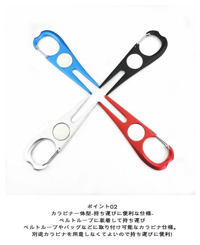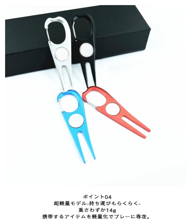 | オールインワングリーンフォーク マーカー&カラビナ付き 【2個セット】 ポイント01 グリーンマーカー付属 -ラウンドに便利なオールインワン機能- カチッ「と簡単に取外し♪ ポイント02 カラビナー体型-持ち運びに便利な仕様- ベルトループに装着して持ち運び ベルトループやバッグなどに取り付け可能なカラビナ仕様。 別途カラビナを用意しなくてよいので持ち運びに便利! ポイント03 コンパクトサイズ-薄さ5mm以下- サイズ(約)10cm×3cm コンパクトサイズ設計。 持ち運びもジャマにならない圧倒的コンパクトさ。 ポイント04 超軽量モデル-持ち運びもらくらく- 重さわずか14g 携帯するアイテムを軽量化でプレーに専念。 ポイント05 選べる4カラー コーディネートがしやすいシンプルな4カラー ラウンド当日の服装・コーディネートや気分によって使い分けも◎ 使いやすい4カラーを用意しました。 | |