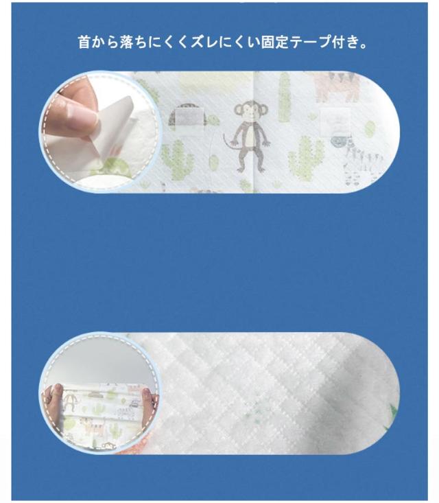 | 大人気子供用食事エプロン。50枚入り 使い捨てのお食事エプロンなので衛生的! ペーパービブよりも吸水力に優れた不織布のエプロンです。 首から落ちにくくズレにくい固定テープ付き。 破れにくい3層構造、しっかりとした不織布で作られており、離乳食の時期や食べこぼしの心配なし。 動物柄やパイナップル柄など、かわいらしいデザインが特徴。 お出かけや外食時にも便利な携帯用で、持ち運びが簡単。 裏には防水・漏れ防止の防水フィルムがついていますので、ミルク、お湯や水を飲む時も赤ちゃんの服を濡らす心配がありません。防水で通気性がよく、夏に着けても蒸し暑く感じません。 お気に入りの可愛いお洋服が汚れないように設計をさせていただきました。 男の子にも女の子にもぴったりなアイテムで、出産祝いにも最適です。 | |
