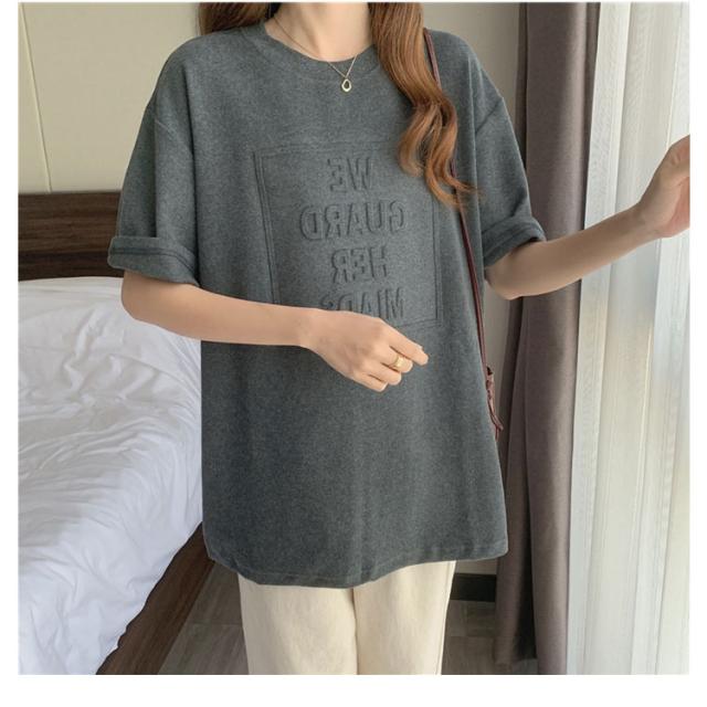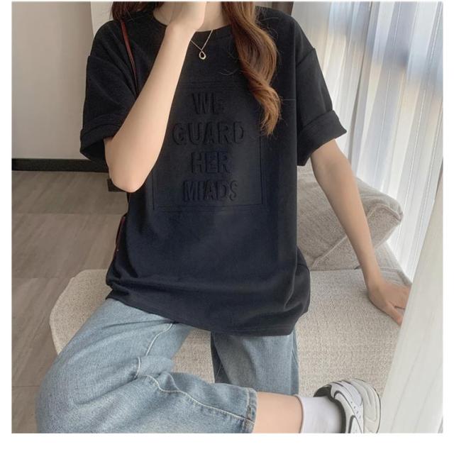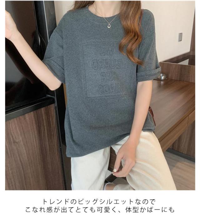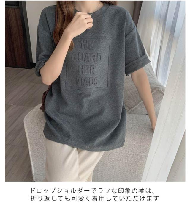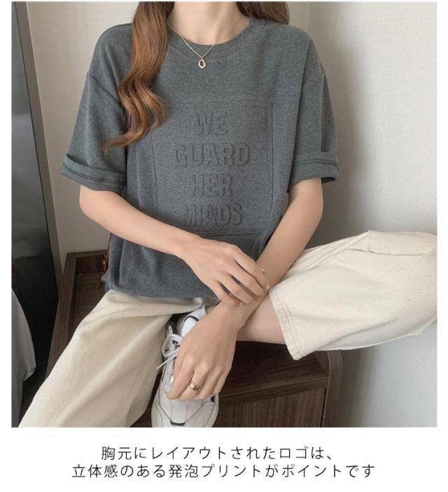 半袖 Tシャツ カットソー ドロップショルダー Tシャツ ティーシャツ エンボス加工 プリントTシャツ 立体 3D デコボコ 重ね着 立体ロゴ クルーネック 立体ロゴ 通勤 トップス カジュアル ロゴTシャツ プルオーバー 英字 ブラック ホワイト グレー ブラウン