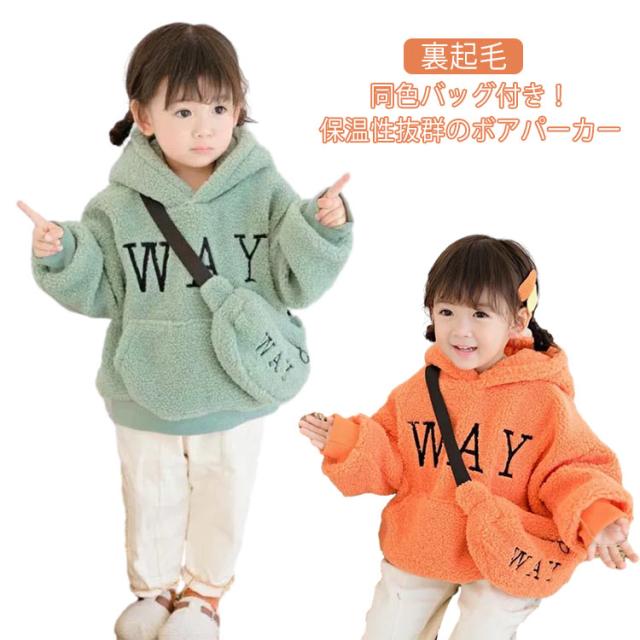送料無料 ボア パーカー キッズ ボア ふわふわ もこもこ 裏起毛 裏ボア プルパーカー 子供服 バッグ付き パーカー フード トップス 女の子 男の子 暖かい あったか ボアパーカー 防寒 保温 子ども服 ロゴ 秋服 秋 冬服 通園 通学 90 100 110 120 130 140 150