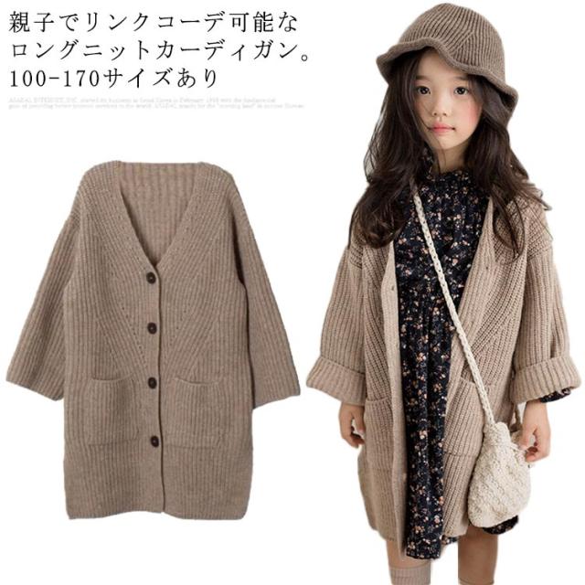 ニットカーディガン キッズ ニット カーディガン ロング Vネック ボタン 秋 冬 アウター 羽織り ポケット付き 韓国 子供服 女の子 100 110 120 130 140 150 160 通学 小学生 おしゃれ ママとお揃い 大きいサイズ