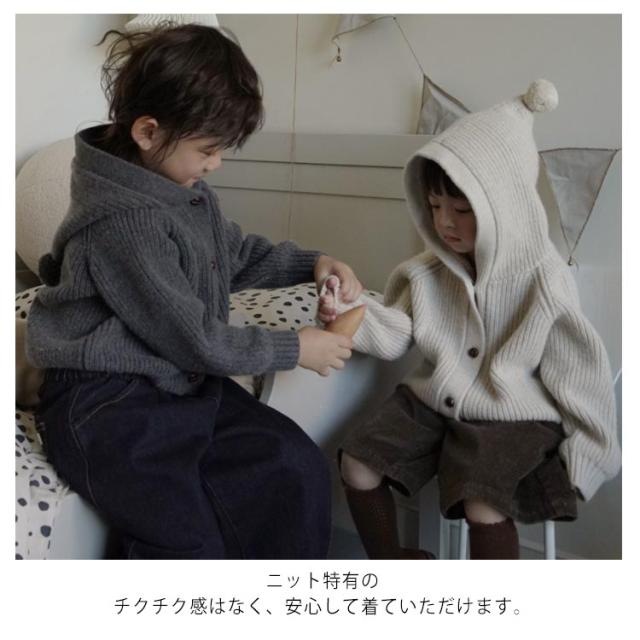 | 80?140cmサイズ!キッズ向けのフード付きカーディガン。 全体的にはゆったりとしたシルエットでお子様をすっぽりと包んでくれます。 大きめのフードも付きでお出かけの防寒防風対策にも◎ 厚手のニットで丁寧に編み込まれているので、伸縮性に優れ、ストレスフリーな着心地です。 ニット特有のチクチク感はなく、安心して着ていただけます。 バランス良く着こなしやすい着丈で、ワンピースや人気のロングパンツとの相性はバツグン! | |