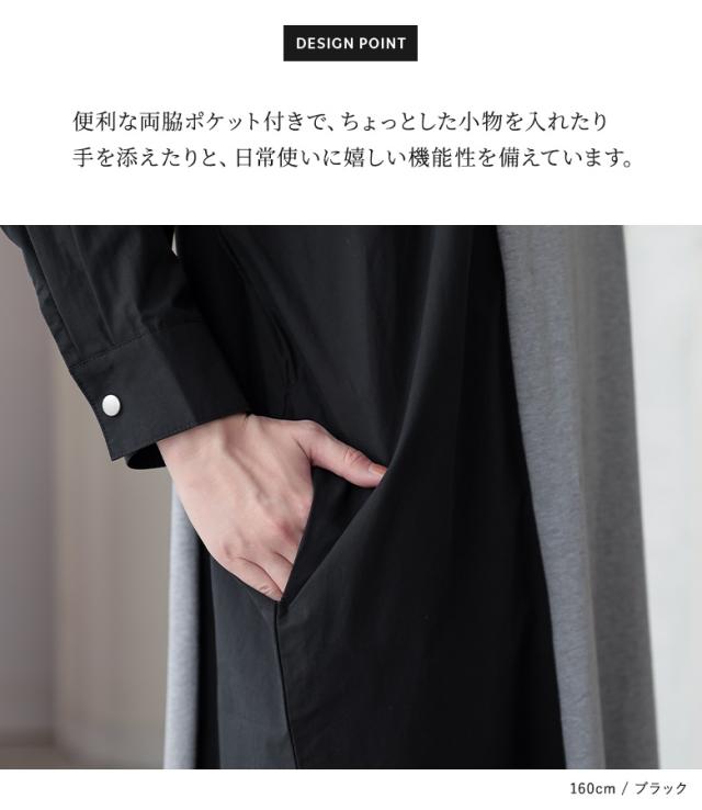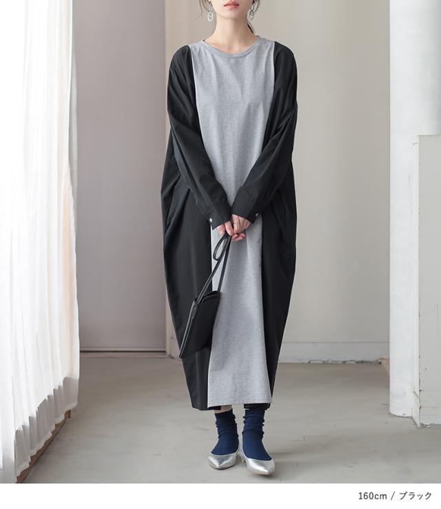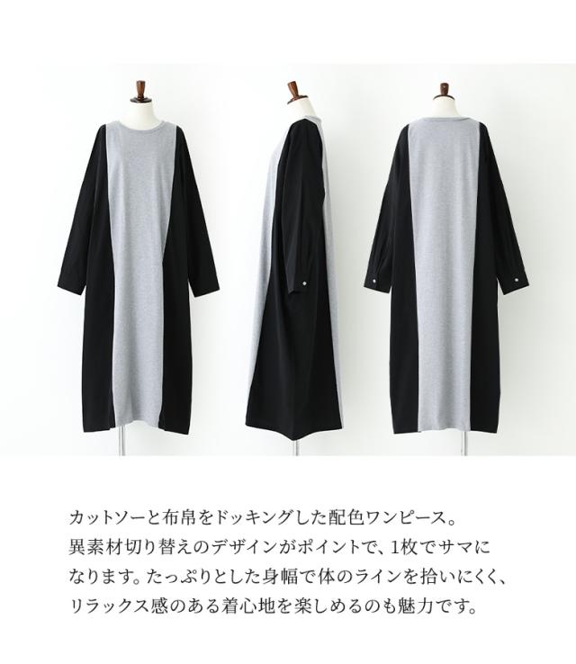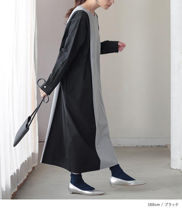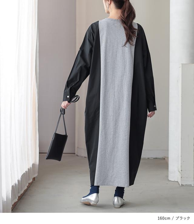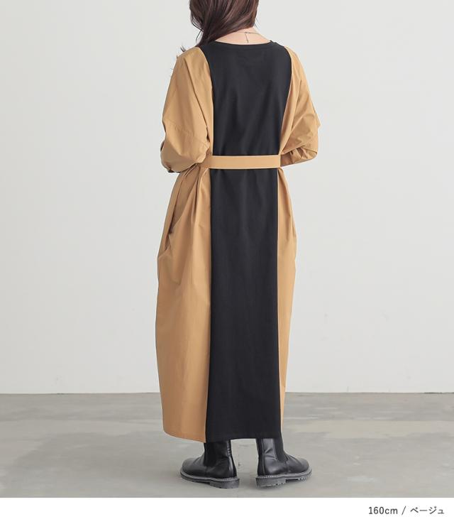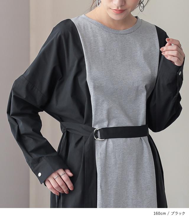 <冬新作>『ベルト付き異素材配色ワンピース』【メール便不可】【30】[ワンピース ロング レディース 長袖 配色 異素材 ドッキング カットソー コットン100% ベルト付き 体型カバー ポケット 春 秋]