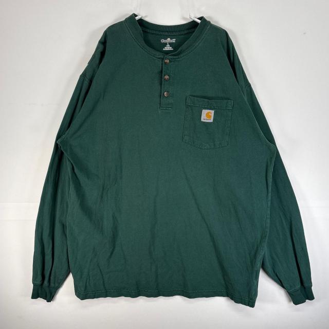 古着 カーハート Carhartt 長袖Tシャツ ヘンリーネック 肉厚 フェード ワンポイント ロゴ L グリーン 無地 メンズ