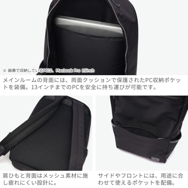 オンオフ問わず活躍するデイパック。A4対応のサイズ感で13インチのPCも収納でき、普段使いから日帰り旅行まで幅広く対応可能です。素材は撥水加工を施したナイロンツイルとブライドルレザーを組み合わせ、上品な雰囲気を演出。サイドやフロントの多彩なポケットなど、整理のしやすい機能性にもこだわりました。リュックストラップと背面はメッシュ素材で、疲れにくいのも魅力です。