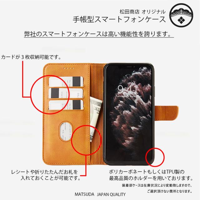 | 特徴 | 1.カメラホール ・カメラホール、指紋認証ホールなどに一点ずつ手作業で塗装し、コーティングしております。・手帳型ケースは厚みがあるため、スマホをテーブルや床おいてもレンズなどを傷つけません。 2.ケースのまま充電 ・QIワイヤレス充電に対応しておりますので、ケースのままワイヤレス充電が可能です。※機器の種類によりましては使用できません。 ・手帳型ケースを装着したまま、充電やイヤホンをすることがかのです。 ・写真撮影時にもケースをしたままお使いいただくことができます。 3.ストラップホールあり ・上側に一つストラップホールがあるので、普通ストラップ、ネックストラップやチエーンの装着が可能です。 4.カード収納 ・クレジットカード、または紙幣やレシート、定期、ポイントカード、名刺などが入れられる便利なポケット付き。 ※機種によってカード収納枚数が異なります。 ※本体の磁気の影響により、交通ICカードは使用できない場合はございます。 5.マグネット内蔵 ・マグネットが内蔵されているので、ケースをしっかりと固定することができ、バッグの中でも開く心配がありません。 6.操作簡単 ・手帳型カバーを装着したまま、イヤホンや充電などをすることが可能です。 | |||||