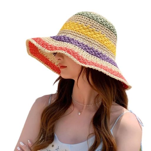 [ITISYOU] レインボーハット 麦わら帽子 バイザー カラフルストライプ レインボー 帽子 UVカット レディース (アプリコット)