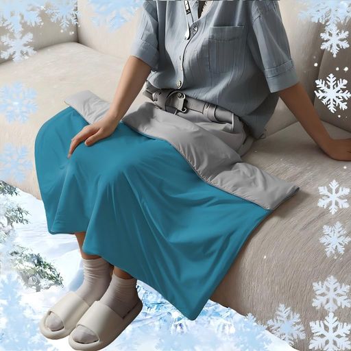 冷房の膝掛け革命サイズ(70×100cm):ひざから足首をピタリカバー。ひんやり面を外側にして冷風を遮断、裏返せば中綿保温層がお腹冷えを防止。「ひざ冷却+お腹保温」の局所温冷で、エアコン設定温度を2°C上げても快適!