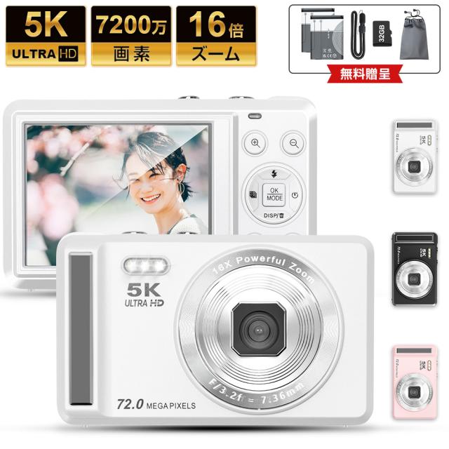 【2個バッテリー+32GB Micro SDカード付き】デジタルカメラ 5K録画 7200万画素 子供用トイカメラ 2.8インチ大画面 キッズカメラ 16倍ズーム 子どもカメラ タイマー撮影 コンパクトデジタルカメラ 連写 Webカメラ 小型 軽量 Vlog 運動会 修学旅行 誕生日 初心者向け 送料無料