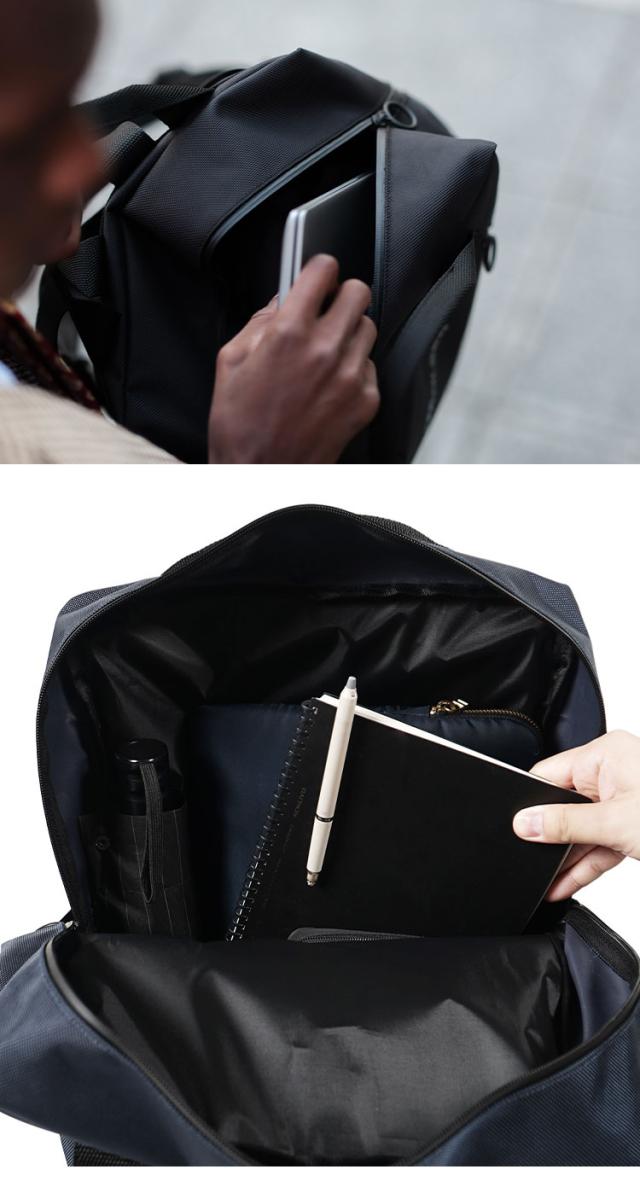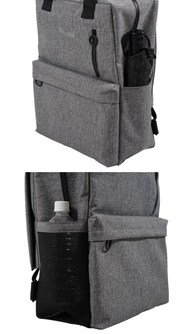 水滴の侵入を防ぎ、急な天候の変化にも対応可能な止水ジッパーを搭載したバッグパックは、フロントポケットはもちろん、両サイドに通気性の優れたメッシュポケットと、ボトルや傘が収納できる21cmのポケットを搭載。