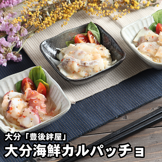 | 大分産の新鮮な真鯛とぶり、真蛸を切身にしてさっぱり風味のカルパッチョに個食パックしました。そのままでも、サラダと合わせて海鮮サラダとしても美味しくお召し上がり頂けます。 |