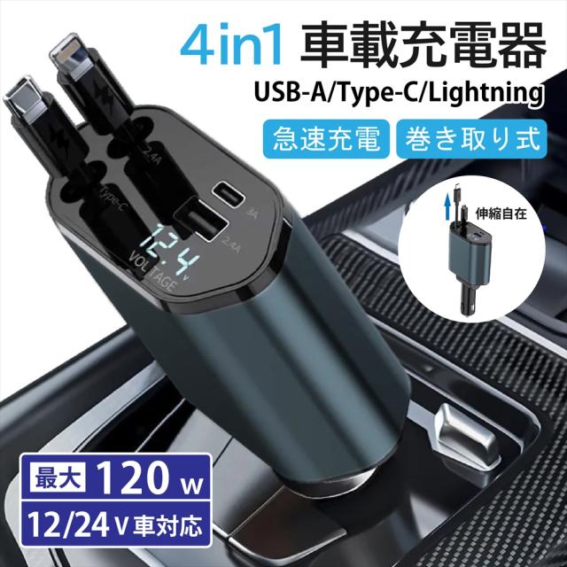 車載充電器 type-c 巻き取り式 充電ケーブル リール式 4in1 シガーソケット 急速充電 USB タイプC 最大120W 4ポート 車載充電器 Type-C 【C1】 カーシガー Lightning 4台同時充電 12V 24V 車対応 汎用 乗用車 トラック 車載 スマホ スマートフォン ノートPC タブレット ipad