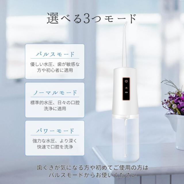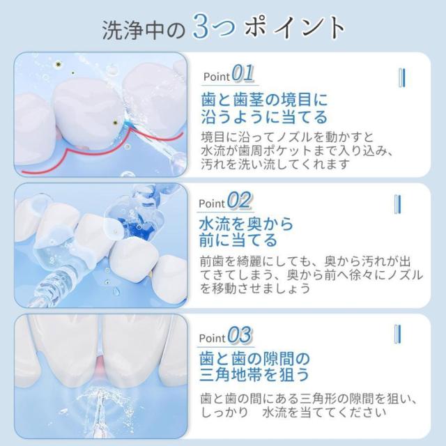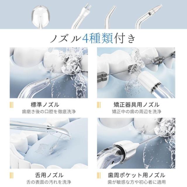 【3つモード調節可能&4本替えノズル】ワンボタン操作の3つモード、パルスモード、ノーマルモード、パワーモード、やさしぃモードから強いモードまで、必要に応じて調整できます。細かい調整ができるので、敏感な人にも適用されます。また、セットには標準ノズル、タングクリーナーノズル、合計5本ノズルが付属されています。ご使用シーンに応じてノズルを選択し利用することができます。