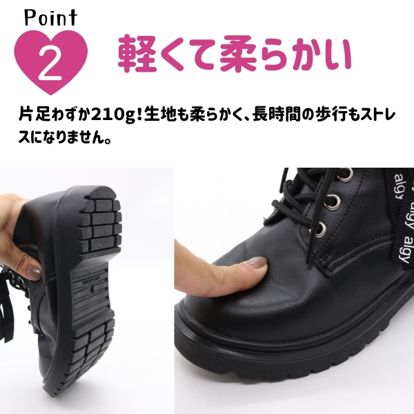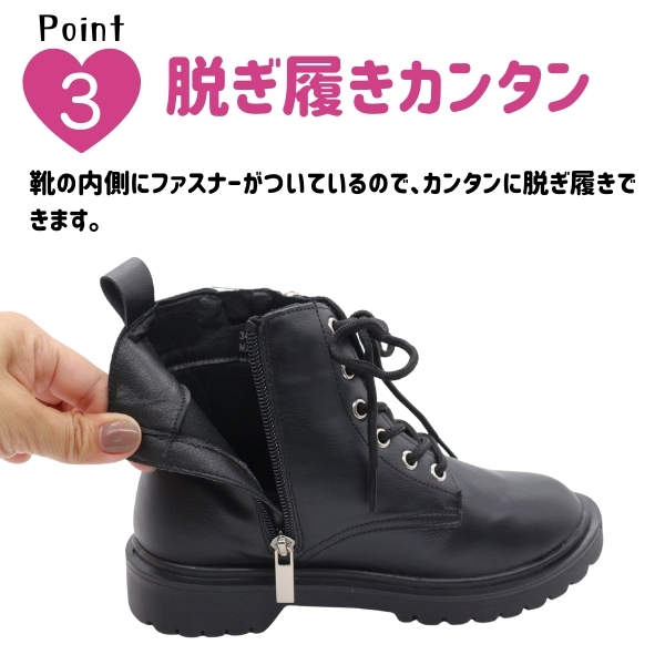 ロゴテープ入りのダブルファスナーが、かっこよさとかわいさを演出します。ブーツなのに、軽く、屈曲性がよく動きやすいです。生地も柔らかく、まるでスニーカーのような履き心地です。安定感のある3センチヒールでスタイルアップ効果もあります。