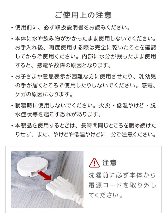 | 注意事項 | ※コントローラーは、水洗いしないでください。乾かないうちに使用しないでください。故障の原因となります。 ・洗濯機は使用しないでください。 ・低温火傷や脱水症状をおこすおそれがありますので、一定時間ごとに脚を動かすなど、注意して使用してください。 次のような方がお使いのときは、特に注意してください。 ・特に乳幼児や小さなお子様、ご老人、病人、皮膚の弱い方、自分で温度調節のできない方。 風邪薬、睡眠薬など眠気をさそう薬を服用された方。深酒をされた方や疲労の激しい方はご注意ください。 ・皮膚の弱い方は厚手の靴下などを履いて使用して下さい。 ・時々体を動かすように、また居眠りやうたた寝をしないように周囲の方もご注意ください。 ・万が一低温やけどをされた方は、ただちに専門医で受診して下さい。 ・火災・感電・ケガの原因になりますので改造や分解をしないで下さい。 ・本体にむやみに水をかけたり、落したり踏みつけないで下さい。 ・他の暖房器具と併用したり、布団など保温性のよい物をかぶせないで下さい。 故障や発熱による事故の原因となります。 ・低温やけどの原因となりますので就寝時に使用しないで下さい。 ・使用しない時は、必ず先端の電源プラグを持ってコンセントから抜いて下さい。 ・新しい畳の上で使用されますと、足温器本体の下の畳が変色することがあります。 これは青畳が直射日光で変色するのと同じ現象です。 ・熱に弱い敷物や床面(銘木床、寄木床など)の上で使用すると、熱により変色、変形する場合がありますので、 足温器本体の下にお手持ちの毛布や、毛足のないカーペットなどを敷いて下さい ・商品は、モニターによって色合いが異なって見える場合があります。 ・仕様・デザインは改良のため予告なく変更することがあります。 |