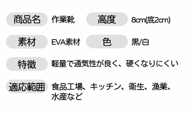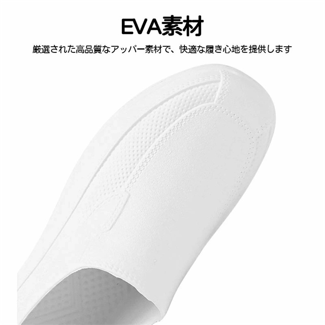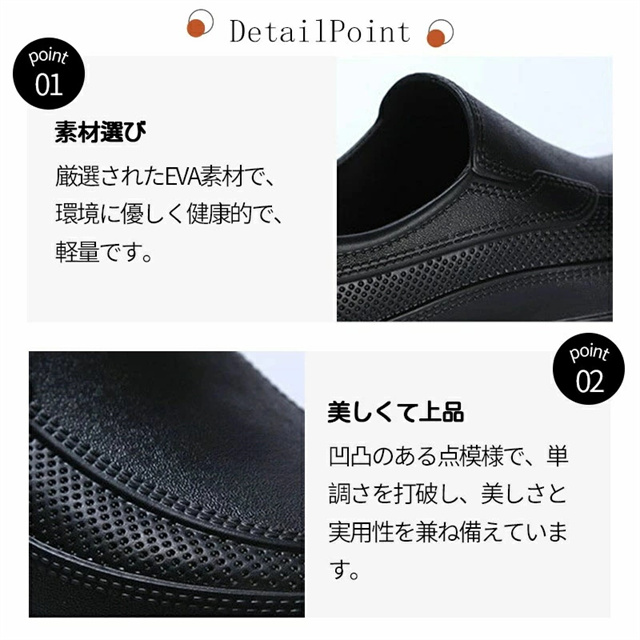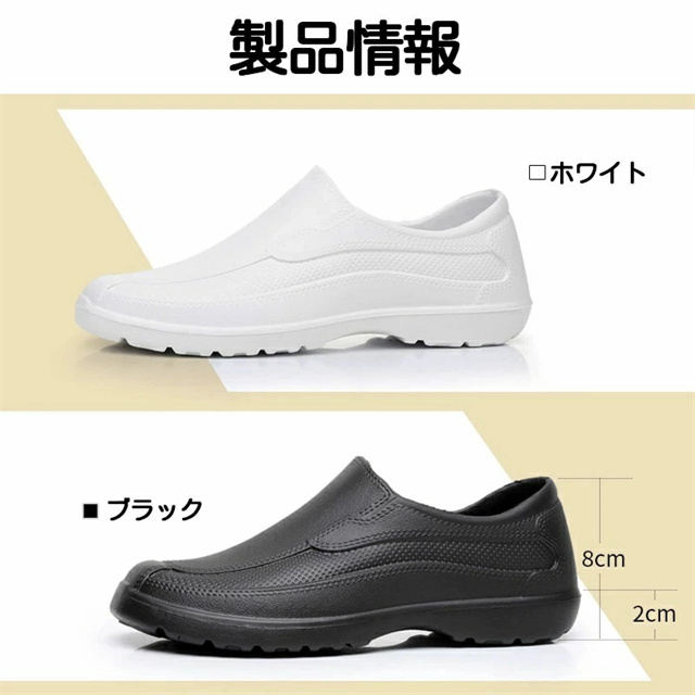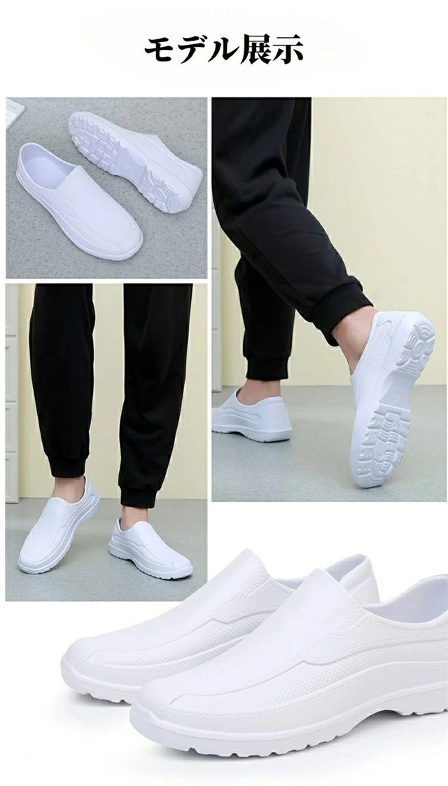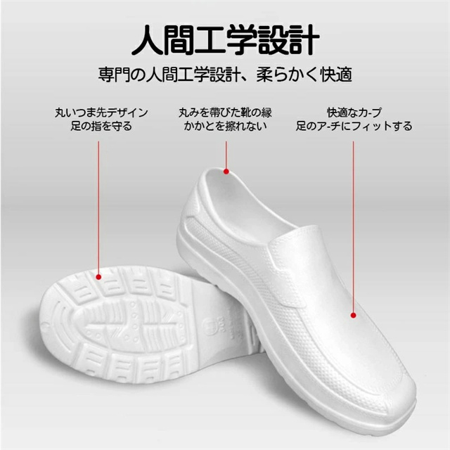 【素材】EVA素材で柔らかく屈曲性があり、フィット感よく動きやすい。 【防水防油】水と油に強くすべりにくい。耐摩耗性があるので靴底が減りにくく、スニーカーのような履き心地です。 【滑り止め】アウトソールは滑り止め機能搭載で、滑りにくいから安心して歩きます。クッション性でストレスが吸収され、足が疲れません、摩擦にも強いから、長く持ちます。 【快適性】EVAを採用し足を柔らかく優しく保温、暖かく快適です。サイズが豊富なのでいろんな方にお使いいただけます。 【適用対象】男性、女性、学生、両親。飲食業 居酒屋 料理店などでも適応。軽く、カジュアルなデザインは、シンプルゆえに合わせるスタイルを選ばず、日常の様々なシーンで活躍してくれます。 新作追加:滑り止め最強版 片方で約140グラム、1足で280グラムの軽量モデル。柔らかい素材で心地よいはき心地を実現。長時間着用しても疲れません。 防水・防油に適したEVA素材を採用。油や汚れも簡単に拭き取れるので、調理靴、キッチンシューズ、厨房シューズ、コックシューズや安全靴等汚れやすい仕事に大変適しています。 靴底に滑り止め機能を加工。滑りやすい環境でも安心して作業ができるので、厨房などで大活躍。 |