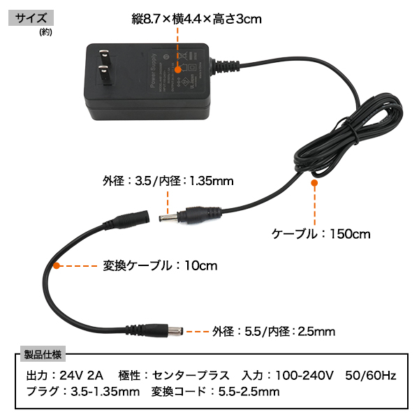 24V 2A汎用スイッチングACアダプター(プラグ 外径 3.5mm 内径 1.35mm / 外径 5.5mm 内径 2.5mm 対応)24V 2A 電気安全法 PSE適合商品 ACアダプタ 3.5-1.35mm 変換ケーブル5.5-2.5mm 送料無料