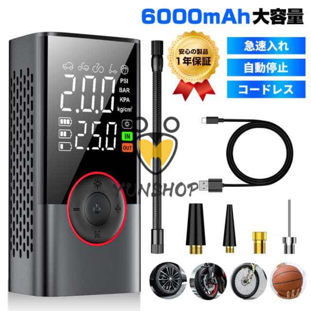 電動空気入れ 多機能 急速充填 空気入れ 自動停止 コードレス 充電式 エアポンプ 車 バイク 自転車 自動車 小型 コンプレッサー