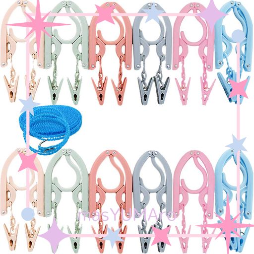 YOUOWO 旅行ハンガー 携帯ハンガー 12個入り 洗濯ロープ1本 旅行用ハンガー セット 折りたたみ式 旅行 出張など 洗濯 物干し 便利 軽量 トラベル用品 6色 ピンチ24個付き
