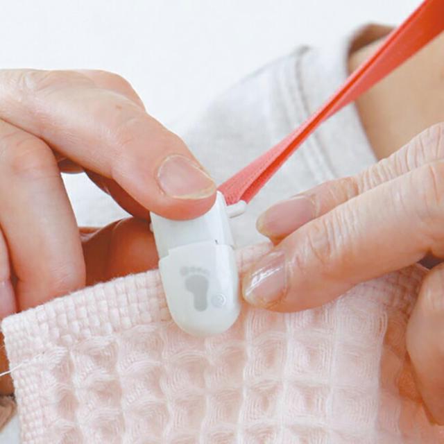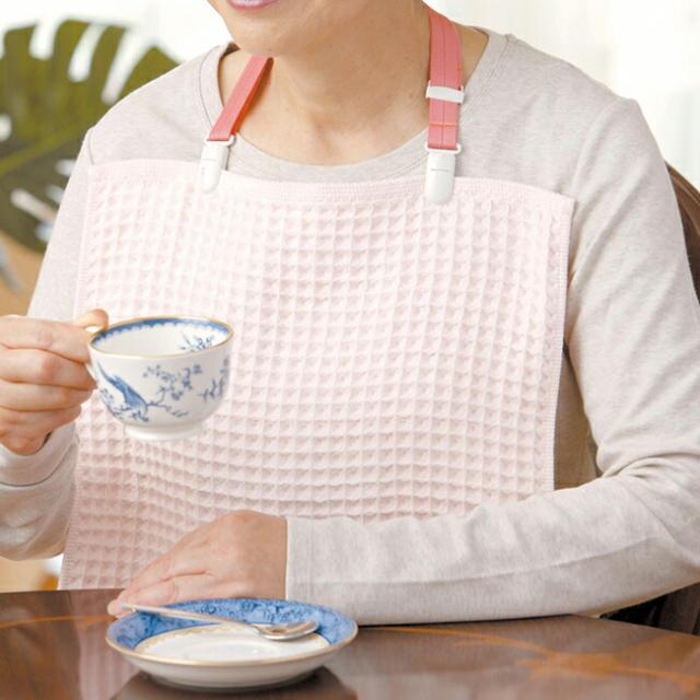 「お食事エプロンのびるクリップ 403783」は、お気に入りのタオルやハンカチを、簡単にエプロンに変えられる便利アイテム。
