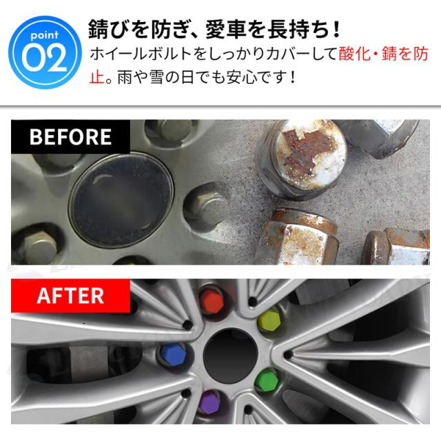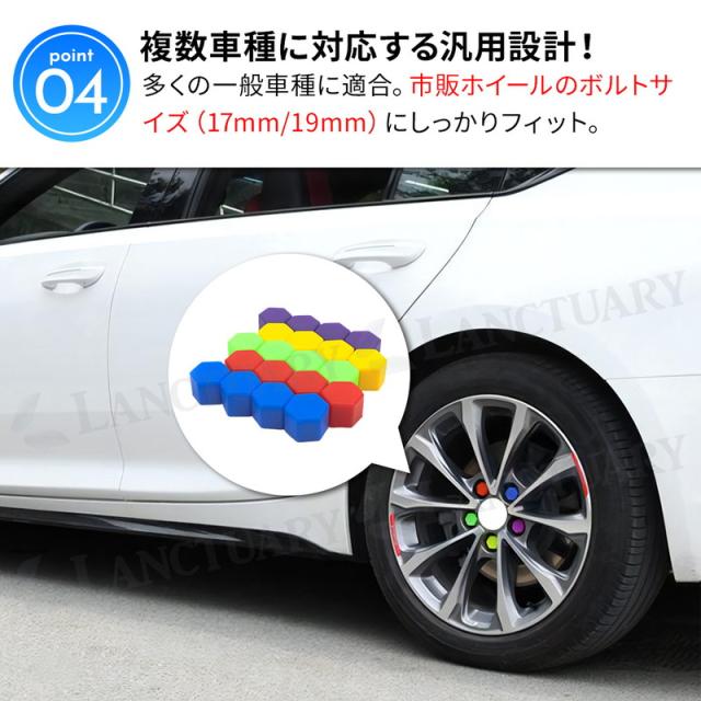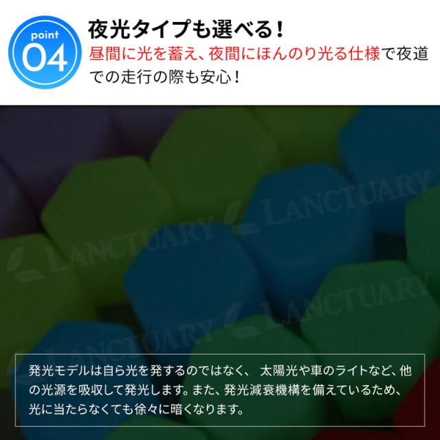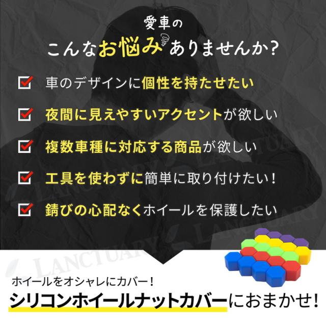 | 商品の説明 | 簡単装着でオシャレ度アップ! シリコンホイールナットカバー 01:こんなお悩みありませんか? ・車のデザインに個性を持たせたい ・夜間に見えやすいアクセントが欲しい ・複数車種に対応する汎用性のある商品が欲しい ・工具を使わずに簡単に取り付けたい! ・錆びの心配なくホイールを保護したい ホイールを彩るカラフルカバー! 愛車をおしゃれにドレスアップしながら、錆予防や盗難対策にも効果的なシリコンラバーカバー。豊富な10色展開で、愛車に個性的なアクセントをプラスします! 特徴1 ワンタッチ装着OKなシリコン素材! 柔軟なシリコン素材だから工具不要で簡単に取り付け可能。誰でも手軽にお使い頂けます。 特徴2 錆びを防ぎ愛車を長持ちさせます! ホイールボルトをしっかりカバーして酸化・錆を防止。雨や雪の日でも安心です! 特徴3 愛車の印象をオシャレにチェンジ! レッド、ブルー、パープル、グリーン、イエロー。鮮やかな5色で足元に個性をプラス。 特徴4 複数車種に対応する汎用設計! 多くの一般車種に適合。市販ホイールのボルトサイズ(17mm/19mm)にしっかりフィット。 特徴5 夜光タイプも選べる! 昼間に光を蓄え、夜間にほんのり光る仕様で夜道での走行の際も安心! 発光モデルは自ら光を発するのではなく、 太陽光や車のライトなど、他の光源を吸収して発光します。 また、発光減衰機構を備えているため、 光に当たらなくても徐々に暗くなります。 工具不要、簡単装着! 個性的なカラーデザインで愛車をもっと快適&スタイリッシュに |
