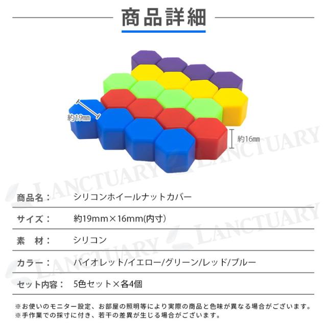 | 主な仕様 | 商品スペック 商品名:シリコンホイールナットカバー サイズ:約19mm×16mm(内寸) 素材:シリコン カラー:バイオレット/イエロー/グリーン/レッド/ブルー セット内容:5色セット×各4個 ・お使いのモニター設定、お部屋の照明等により実際の商品と色味が異なる場合がございます。 ・手作業での採寸に付き、若干の差異が生じる場合がございます。 |