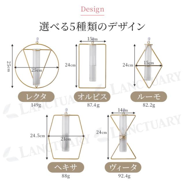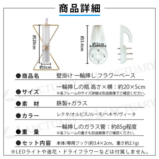 | 主な仕様 | 商品名: 壁掛け一輪挿し フラワーベース 種類: レクタ、オルビス、ルーモ、ヘキサ、ヴィータ サイズ: ガラス管: 高さ 約20cm × 横 約5cm。各フレーム:レクタ:約25cm×25cm、オルビス:約24cm×15cm、ルーモ:約24cm×15cm、ヘキサ:約24.5cm×21cm、ヴィータ:約24cm×14cm 重さ: ガラス管: 約85g程度。各フレーム:レクタ:約149g、オルビス:約87.4g、ルーモ:約82.2g、ヘキサ:約88g、ヴィータ:約92.4g 素材: 鉄製、ガラス 付属品: 専用フック (約3.4cm × 2cm、重さ約2.1g) 注意点: LEDライト、造花、ドライフラワーは付属しておりません。 |