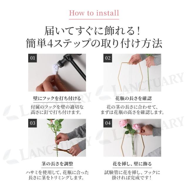 このフラワーベースの魅力は、何といってもその使いやすさです。試験管型の花瓶は口が広く、水の交換やお掃除がとても簡単。取り外しもできるので、いつでも清潔に保てます。フレーム部分は職人による丁寧な手作業で、高温でしっかり溶接されているため、見た目以上に丈夫なつくりです。長くご愛用いただけるよう、細部まで心を込めて仕上げました。取り付けに便利な専用フックも付属しており、届いたらすぐに壁に飾って、気軽に新しいインテリアを楽しめます。