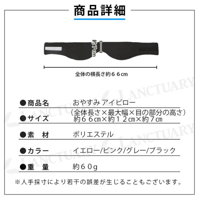 | 主な仕様 | 商品名:おやすみ アイピロー カラー:ブラックイエローグレーピンク 材質:ポリエステル サイズ(約): 66cm×12cm×7cm (全体長さ×最大幅×目の部分の高さ) 重さ(約):60g |