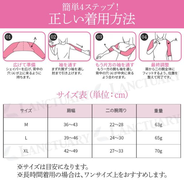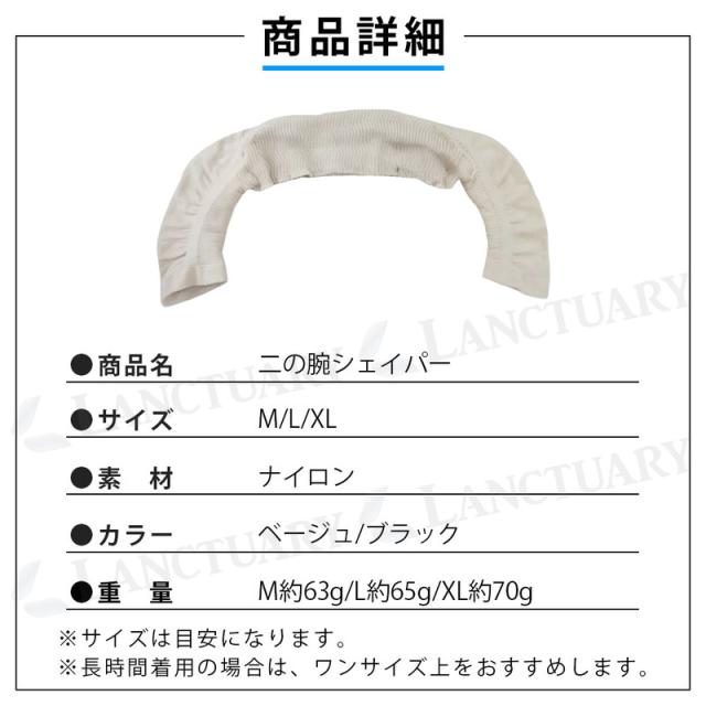| 主な仕様 | 商品名: 二の腕シェイパー 種類: ベージュ、ブラック サイズ展開: M、L、XL Mサイズ: 肩幅 約36〜43cm / 二の腕周り 約22〜28cm / 重量 約63g Lサイズ: 肩幅 約39〜46cm / 二の腕周り 約24〜30cm / 重量 約65g XLサイズ: 肩幅 約42〜49cm / 二の腕周り 約27〜33cm / 重量 約70g 素材: ナイロン |