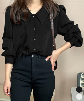 尖った襟がアクセントになったクラシカルなシャツブラウス。