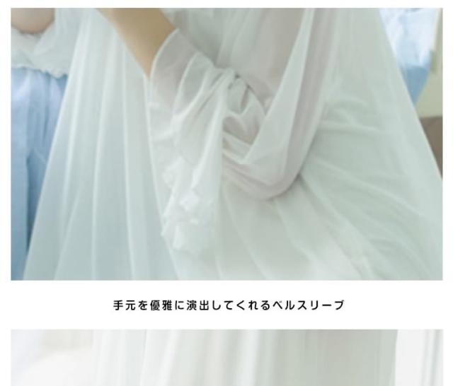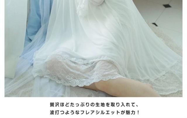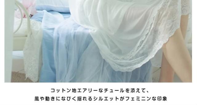| 身も心も溶け込んじゃう!贅沢ほどたっぷりの生地を取り入れて、波打つようなフレアシルエットが魅力!襟ぐりにあしらったソフトなシースルーレースが優しい印象大人の華やぎもプラスコットン地エアリーなチュールを添えて、風や動きになびく揺れるシルエットがフェミニンな印象 | |