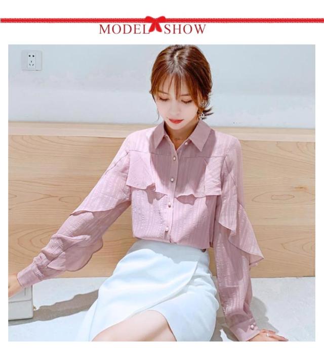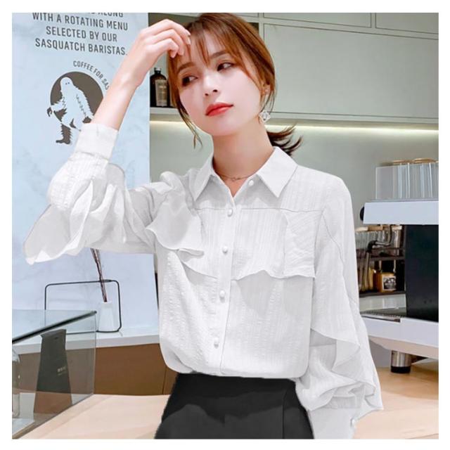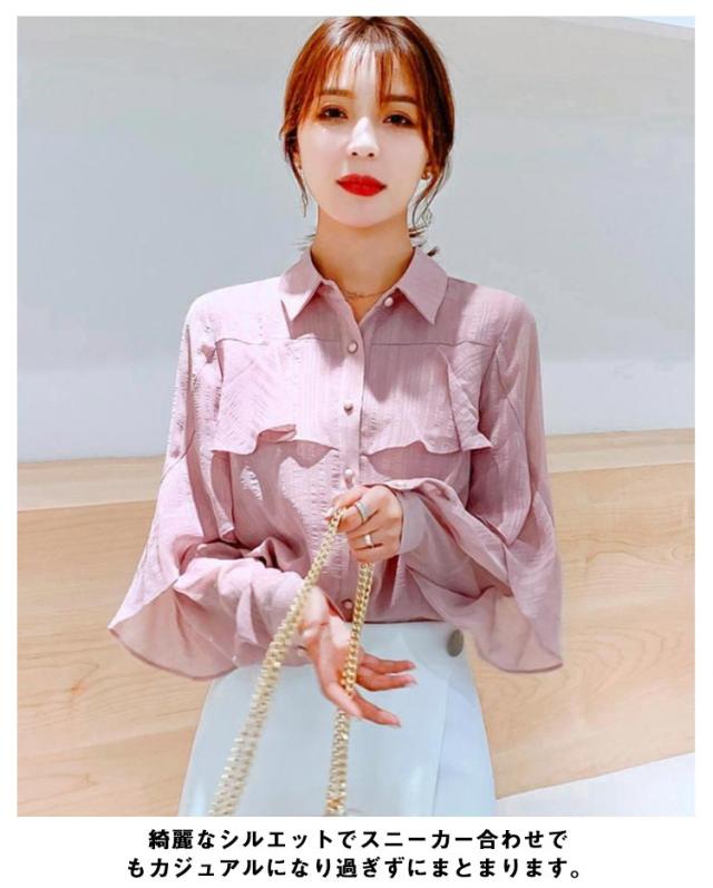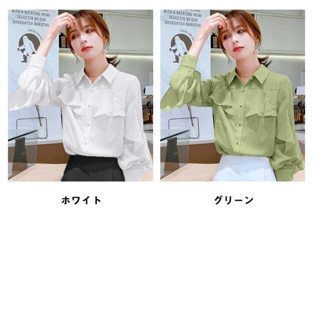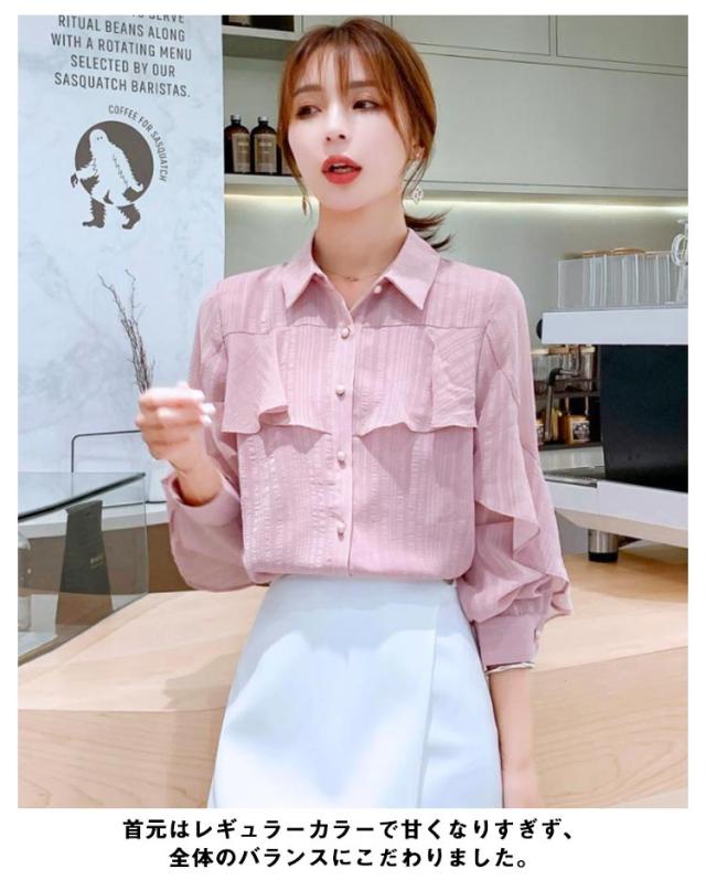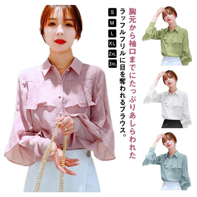 フリル 春 【送料無料】ブラウス レディース 長袖 トップス 通勤 OL オフィス シャツ レギュラーカラー 大人可愛い シャツ 秋服 シャツ 秋 通勤 襟付き 韓国風 カジュアル 無地 シンプル きれいめ 冬