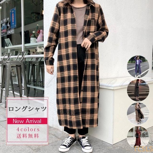 ロングシャツ レディース 長袖 チェック柄 超ロング シャツワンピース シャツコート ライトアウター トップス 前開き 羽織 春秋 おしゃれ