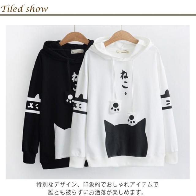 綿 パーカー トップス 猫柄 フード付き レディース ゆったり プルオーバー ナチュラル 長袖パーカー 女子高校生 トレーナー 森ガール 薄手 キュート 春 秋 冬 体型カバー スポーティ ルームウェア 可愛い