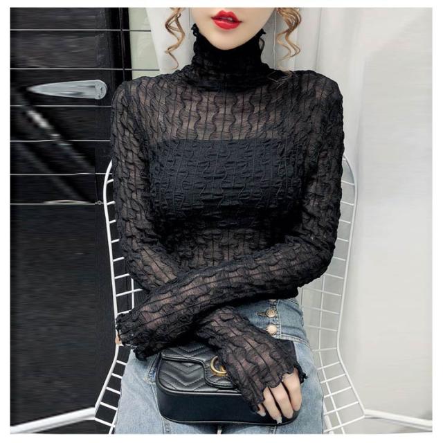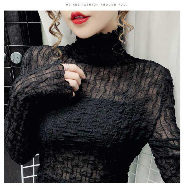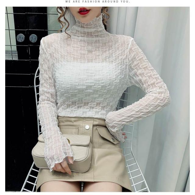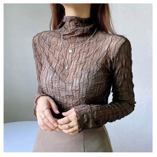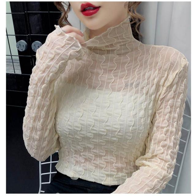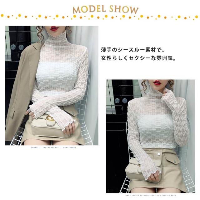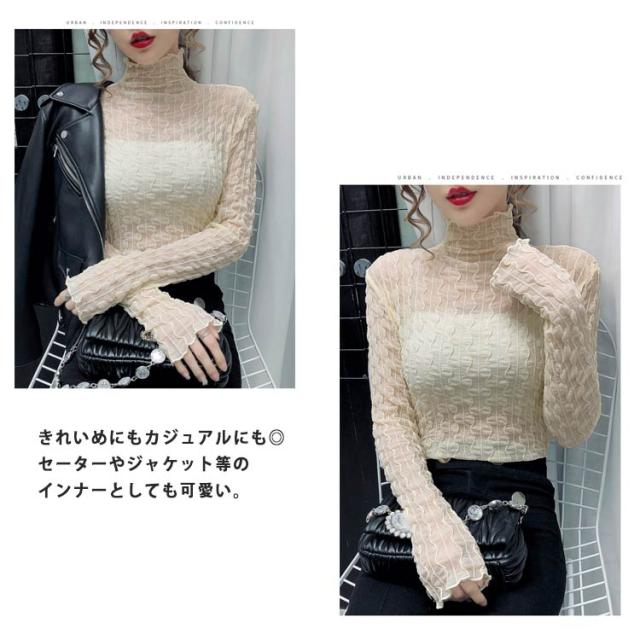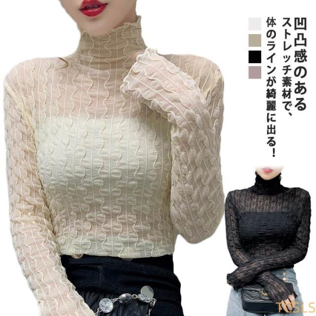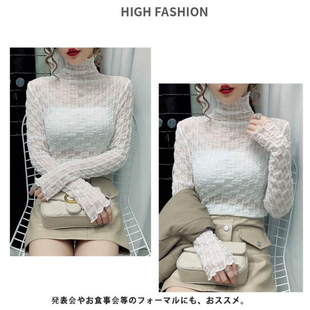 シースルー トップス レディース 秋冬 Tシャツ 長袖 透け感 凹凸感 ストレッチ素材 ハイネック ブラウス インナー レース タイト セクシー くしゅくしゅ 肌見せ 上品 きれいめ カジュアル 30代 40代 可愛い 薄手 薄い 春 夏 秋 冬 送料無料