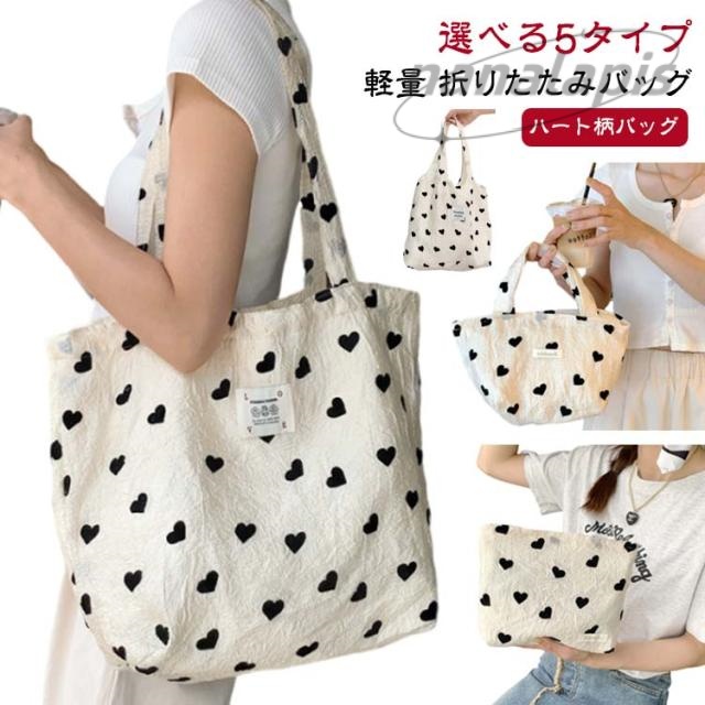 選べる5タイプ ハート柄バッグ 大容量 ポーチ お買い物 ハート柄 おしゃれ 舟型 サブバッグ 化粧ポーチ ハート柄バッグ エコバッグ 軽量 折りたたみバッグ たためる シンプル 可愛い 韓国 バッグ マチ モノトーン 鞄 トート ショルダーバッグ