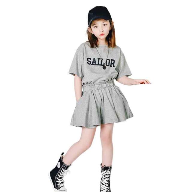 [Rolanko] 子供服 女の子 セットアップ 半袖tシャツ キュロットスカート ガールズ 夏服 スポーツウェア ジャージ 上下セット ダンス 可愛い グレー 160