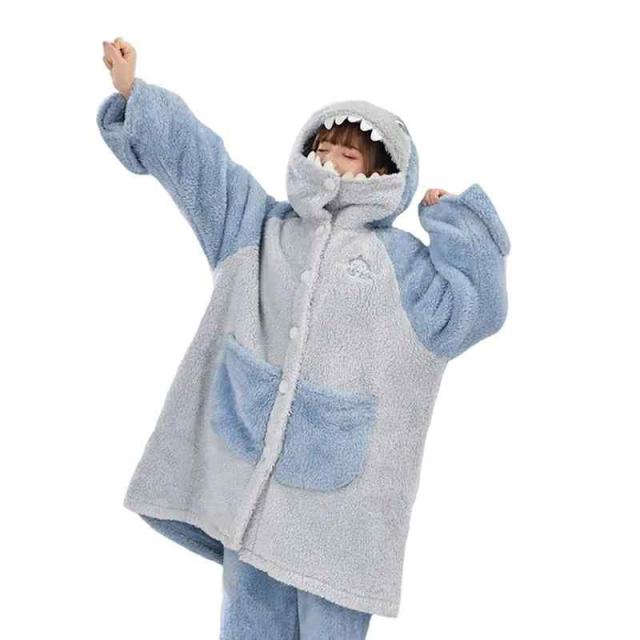TOWYYO サメ パジャマ 上下セット 男女兼用 おもしろ しっぽ 手袋付き フード付き 前開き ふわふわ もこもこ あたたか 防寒 ルームウェア 部屋着 春 秋 冬 レディース メンズ ブルー S