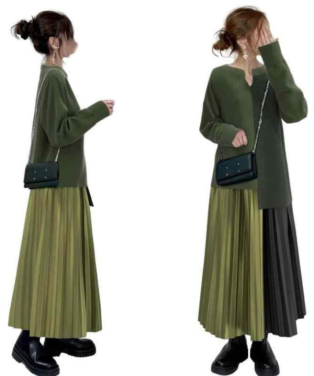 【流行の流れを参考に】vネック、プリーツとカラーマッチングの要素を取り入れ、女性の可愛さを最大開発、優しさの雰囲気を現れます。身頃にゆとりが、鎖骨がちらっと見えて、着痩せ効果が抜群です。プリーツスカートが縦ラインで足をほっそり美しく見せてくれて、太ももやおしりをカバーできるのも嬉しいです