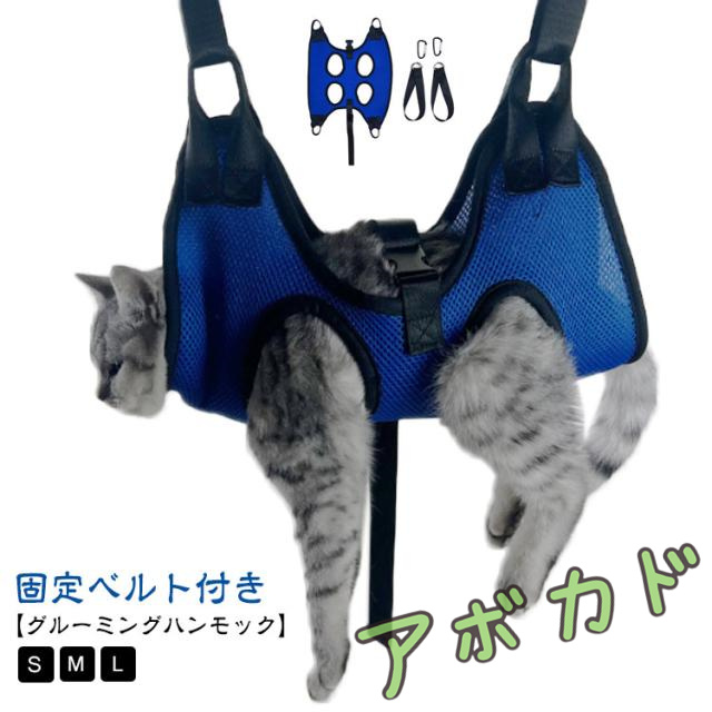 | 【グルーミングハンモック】【S M L】【固定ベルト付き】 新登場吊り上げ式・ペット美容にとっての最適な拘束バッグです! 歯磨き 爪切り 服薬 目薬 介護 耳掃除 入浴 お風呂 シャンプー ドライヤーに使用できます。 ペットの体を優しく包み込み、動きをうまく制限し、安全に自宅ケアができます。 ボディを固定して脱落を防ぐベルト追加しました。 通気性抜群のメッシュ素材を採用しておりますので、長時間使用しても蒸れにくい仕様となっております。 使用方法: ・床や机に本体を広げ ・ペットの脚を4か所の穴に通るようにし ・包み込むような形で両端の輪にフックを通し ・持ち上げ、ポールなどにフックをひっかけて準備完了 | |