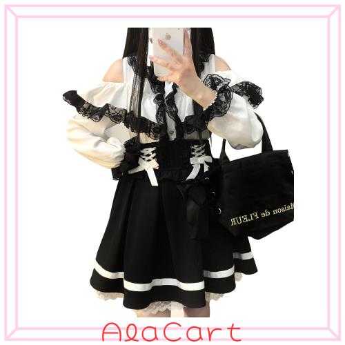 [XHSUKADO] かわいい オープンショルダー ブラウス 量産型 シャツ レディース 2層 レース フリル 取り外し可能 リボン パール 長