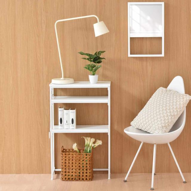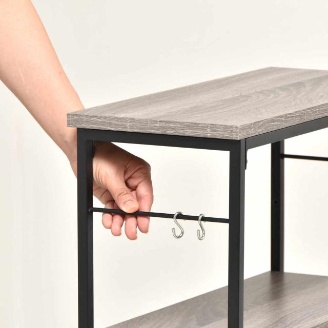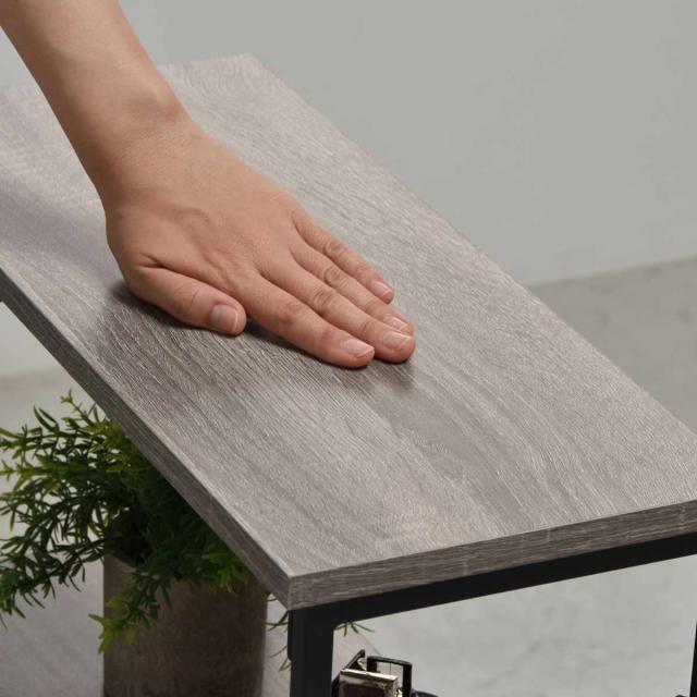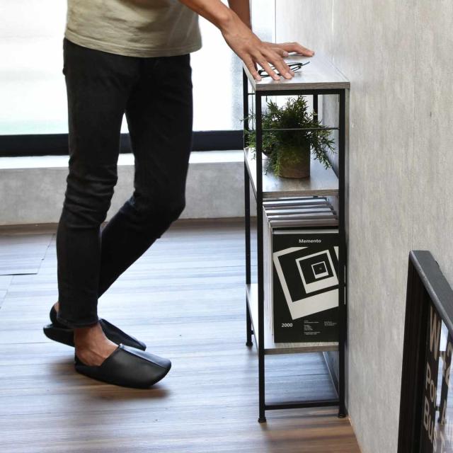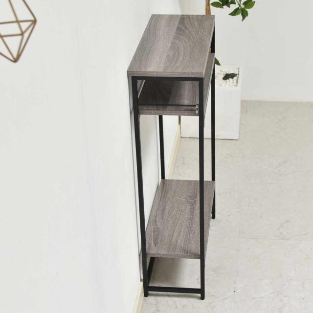 玄関や廊下などの限られたスペースにも置きやすい、スリムなラックタイプのコンソールテーブルです。奥行21cmと圧迫感の少ないデザインで、リビングやキッチンカウンター下、トイレなど場所を選ばずに設置できます。観葉植物やオブジェのディスプレイのほか、鍵やスマートフォンなどの小物置きとしても活躍します。